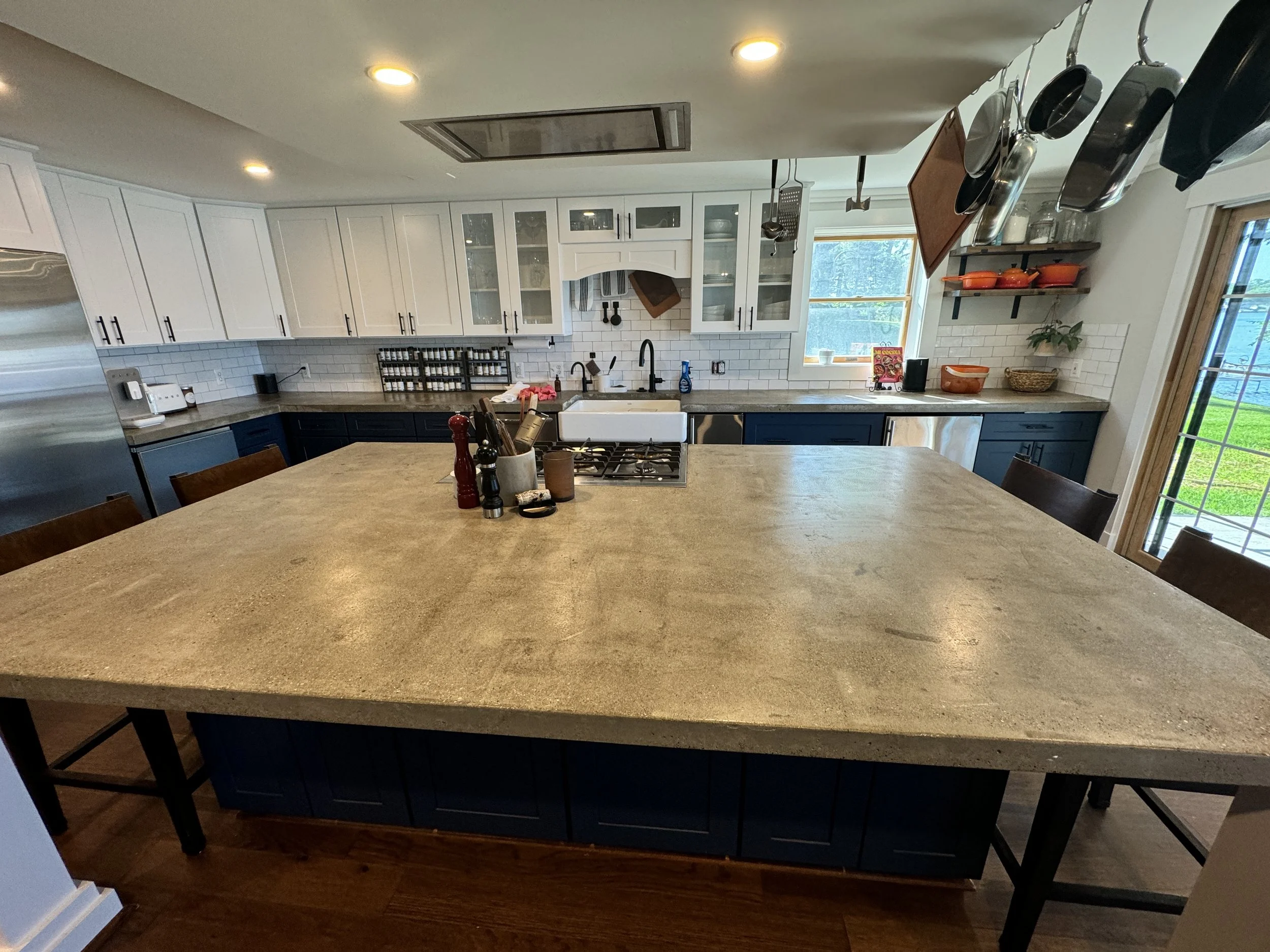 A small lakefront home without the room for a formal dining area was in need of a common use island. Crafted in a combination of the Béton brut and Béton ciré style, the space offers seating for 10 around the heart of the kitchen.